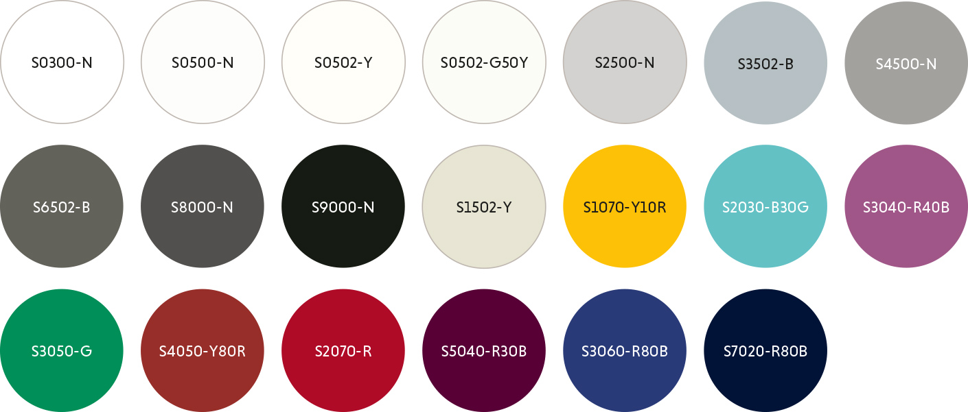 S43 går att få målad i ett brett sortiment av standardkulörer för snabbare leveranser. Därutöver finns i princip alla NCS-skalans kulörer tillgängliga mot beställning (alla färger visas ej på bild här, kontakta Secor för färgprover).