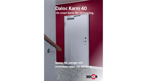 Daloc Karm 40 (K40) är en karmtyp som installeras direkt i den befintliga karmen. Lösningen används främst i kombination med branddörren Daloc S30 och är särskilt anpassad för miljöer i allmänna utrymmen. Daloc Karm 40 motstår brand i minst 60 minuter.