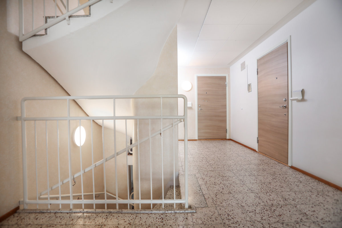 Den charmiga exteriören till trots var det i fjol dags att uppgradera dörrarna till säkerhetsdörrar. Utöver att man ville ha ett mer modernt utseende i trapphusen, stod också ökad säkerhet på agendan. De gamla trädörrarna hade haft sina glansdagar. De var standard för den tid då huset byggdes, men flera av dem hade nu börjat att glappa. Dessutom saknade de säkerhetsaspekter.