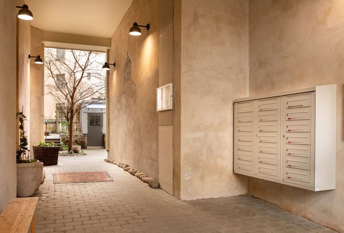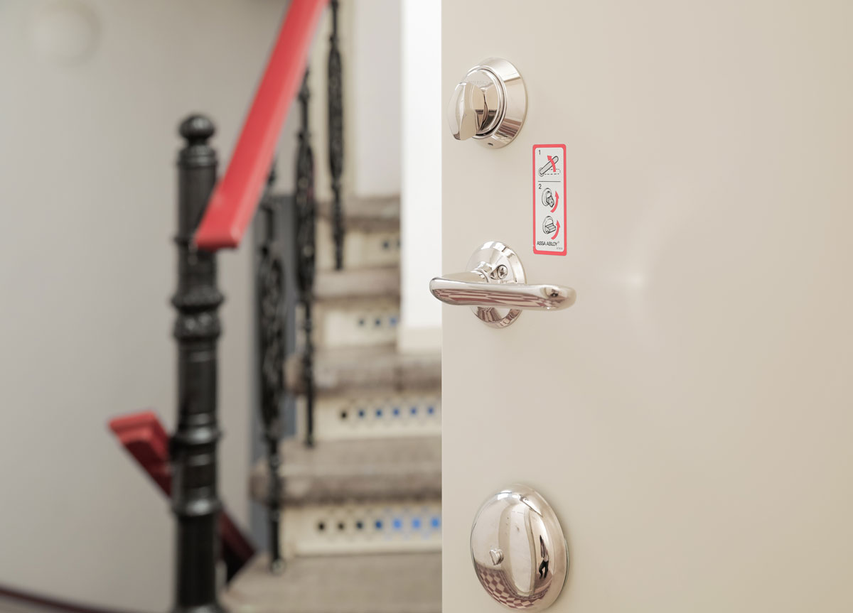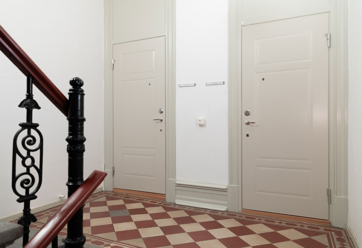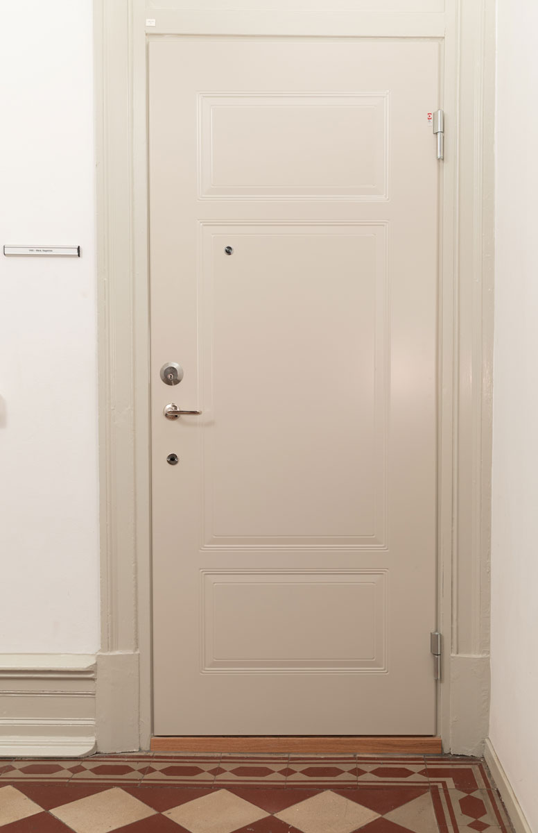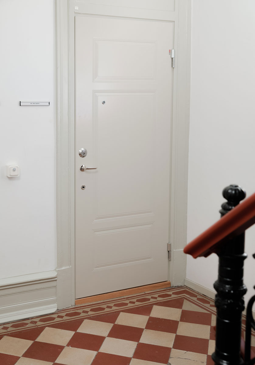 Föreningen valde grågröna säkerhetsdörrar från Daloc, försedda med tre så kallade speglar – en prägling i dörren som ger den en passande design för ett så anrikt hus. Med dessa har föreningen inte bara höjt säkerhetsstandarden, utan också estetiken i de välbevarade trapphusen.